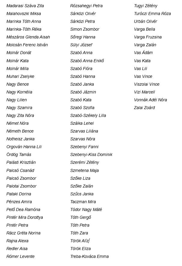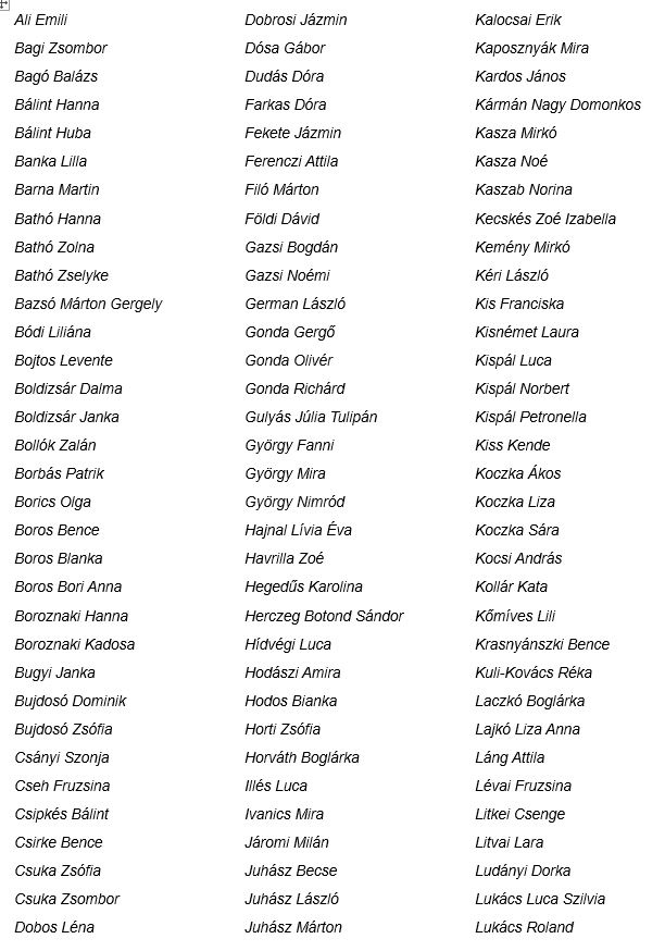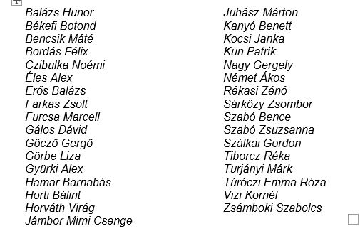 Csapattagok: Földi Dávid, Földi Krisztián, Horti Soma, Pesti Noémi, Pesti Lili, Kollár Kata, Kollár Kristóf, Garamvölgyi Galina, Garamvölgyi Lilla, Nagy Boglárka, Marinka-Tóth Réka.
