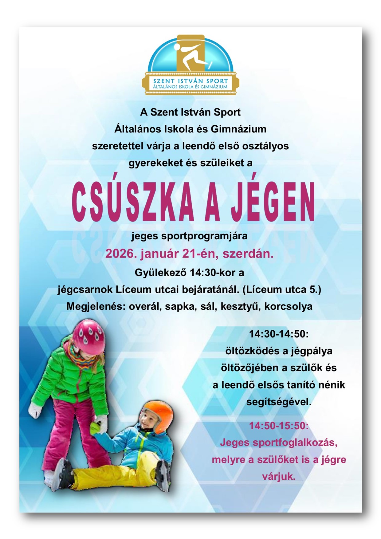 2025.01.23-án csütörtökön délután rendeztük meg „CSÚSZKA a jégen” elnevezéssel a soron következő beiskolázási programunkat, melyben a jégpályára invitáltuk a leendő első osztályos óvodásokat. Először a gyorskorcsolyázó diákjaink bemutató edzéspillanatait nézhették meg a kicsi gyerekek és kísérő szüleik. Versenyzőink szélsebes siklásokkal és látványos váltóversennyel kápráztatták el a nézőközönséget. Ezután zenés bemelegítéssel az ovisok is jégre állhattak és játékos, változatos feladatok segítségével ismerkedtek meg a korcsolyázás alapjaival. A vidám hangulatú, mókás, színes foglalkozás közben remekül érezték magukat kicsik és nagyok, s élményekkel gazdagodva jöttek le a jégpályáról. Nagy szeretettel várjuk a kis óvodásokat a következő programunkra is, mely március 5-én 17 órától lesz az intézményünkben.