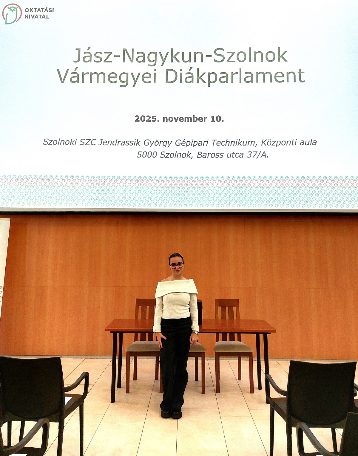 2025. november 10-én a Szent István Sport Általános Iskola és Gimnázium diákönkormányzata képviseletében Pataki Rebeka 10.a osztályos DÖK-elnökhelyettes és Tősér Mária kísérő pedagógus vettek részt a Jász-Nagykun-Szolnok Vármegyei Diákparlamenten Szolnokon. Napirendi pontok elfogadását követően az Országos Diáktanács éves beszámolóját tekinthettük meg egy kisfilmen. Ezt követte az Országos Diákparlament vármegyei képviselőinek megválasztása. A jelöltek között volt Rebeka is, aki határozott beszédével meggyőzte a hallgatóságot, így lett tagja a 6 fős delegációnak. Majd még egy titkos szavazás következett, ahol az Országos Diáktanács tag és póttag személyét kellett eldönteni. Itt egyhangúlag választották iskolánk diákját ODT tagnak, aki a póttaggal együtt a vármegyében működő önálló diákönkormányzattal rendelkező nevelési-oktatási intézmények képviseletét ellátva vesznek részt az ODT munkájában. Diákparlamenti ülés végén a diákok javaslatokat fogalmaztak meg a 2026. évi Országos Diákparlamentre. Rebekának gratulálunk és kívánunk jó munkát, hasznos tapasztalatszerzést az elkövetkező időszakban.